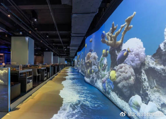 墻壁投影技術(shù)可以應(yīng)用在餐廳的包間里,將3D動(dòng)畫投射到餐廳的四壁,形成一個(gè)完全沉浸式的房間,可以根據(jù)不同的環(huán)境而變化,可以是海底世界,也可以是茂密的叢林,也可以是雪花飛舞,花鳥成群,讓顧客在用餐的時(shí)候,仿佛回到了大自然之中,享受著視覺(jué)和味覺(jué)的碰撞。